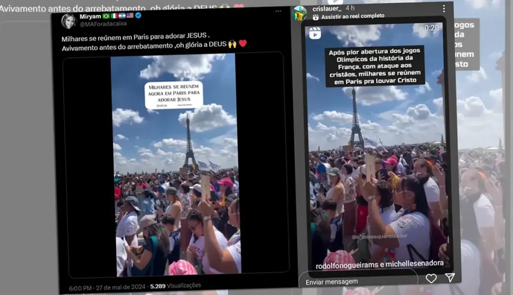 A postagem trazia: “Após pior abertura dos jogos Olímpicos [sic] da história da França, com ataques aos cristãos, milhares se reúnem em Paris para louvar Cristo”. Além de não ter ocorrido ataque a nenhum cristão e ser uma das aberturas mais elogiadas de todos os tempos, contemplando a diversidade, a foto publicada por Cris Lauer nada tinha a ver com as Olimpíadas. Trata-se de uma montagem, mal feita, de evento ocorrido em 25 de maio, ou seja, há 2 meses e 1 dia, e publicado no dia 27 no Twitter/X.