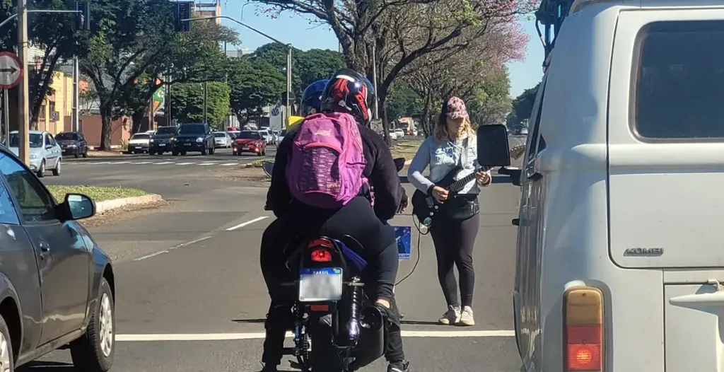 Diferente e interessante Angelo Rigon 2 anos atrás Registro feito por Agnaldo Vieira mostra, no semáforo da avenida Colombo, uma guitarrista com uma caixa amplificada tocando enquanto o sinal está vermelho.