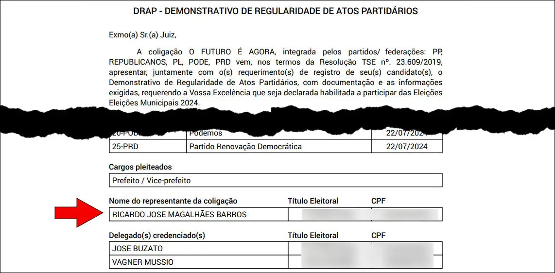 O deputado federal licenciado Ricardo José Magalhães Barros (PP), atual secretário do governo Ratinho Junior (PSD), é o representante oficial da coligação “O futuro é agora” junto à Justiça Eleitoral, de acordo com o Drap – Demonstrativo de Regularidade de Atos Partidários. O advogado José Buzato e o ex-secretário Vagner Mussio são os delegados credenciados.