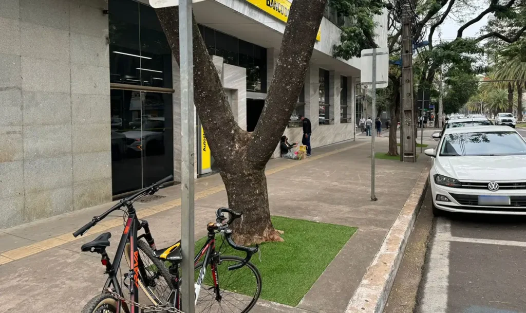 Não bastasse o aumento da poluição visual, Maringá vem sendo tomada por grama sintética, algo que irrita quem pensa em meio ambiente. Como não há legislação específica, agora colocaram ao redor de todas as árvores do passeio público na frente do Banco do Brasil, na avenida Duque de Caxias, centro da cidade.