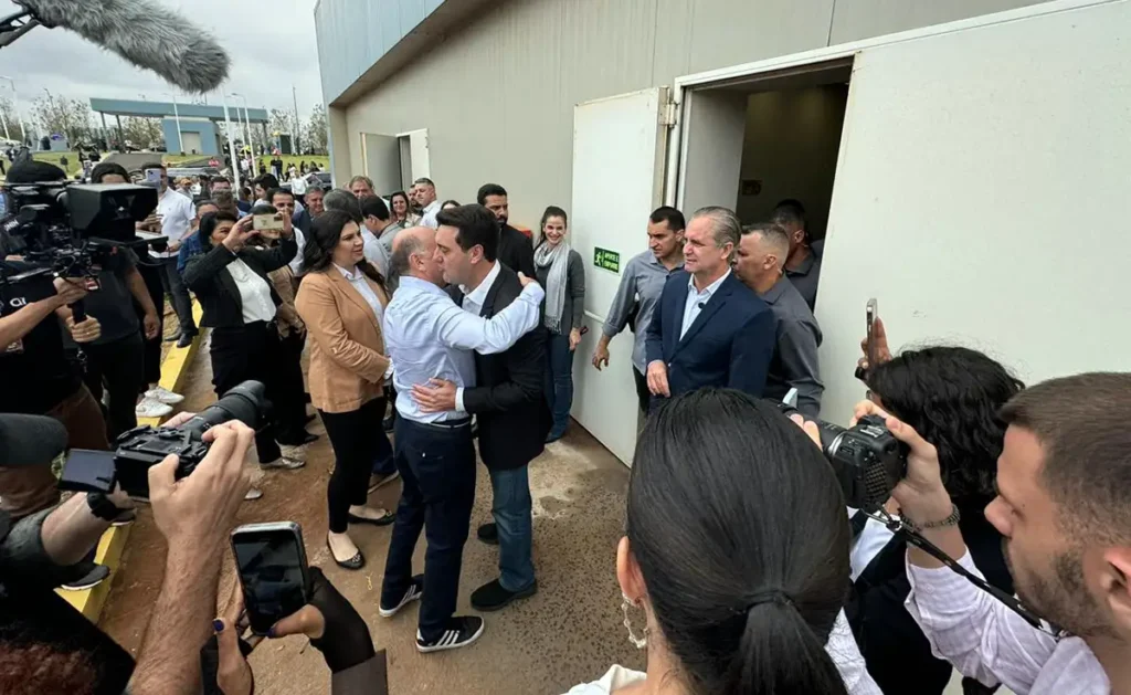 O governador Carlos Massa Ratinho Junior (PSD) foi surpreendido hoje na saída de um dos blocos do Hospital Municipal da Criança, pelo vice-prefeito Edson Ribeiro Scabora (PSD), candidato a prefeito, que estava acompanhado da vice em sua chapa, Ana Nerry (MDB). O local estava tomado por câmeras e entourage de campanha.