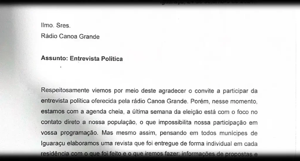 A informação está no Facebook da emissora, que, cumprindo a legislação “e prezando pela democracia”, no último dia 14 enviou para os três candidatos a prefeito de Iguaraçu o convite para a participação de uma entrevista para discutir suas propostas e assuntos relacionados a Iguaraçu. “Porém, recebemos na tarde desta quarta-feira, 25 de setembro, o ofício 004/2024 do PSD Iguaraçu, [em] que disse NÃO para a entrevista que iria ser concedida pelo candidato e prefeito Eliseu Costa, o que lamentamos por parte do nosso ouvinte e de toda comunidade”.
