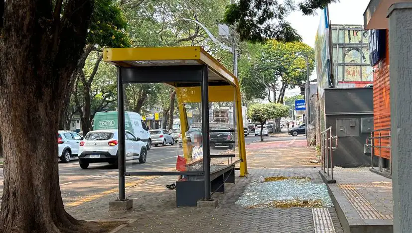 Vidro quebrado por vândalos em abrigos para passageiros do transporte coletivo urbano na avenida Mandacaru, próximo a um shopping.