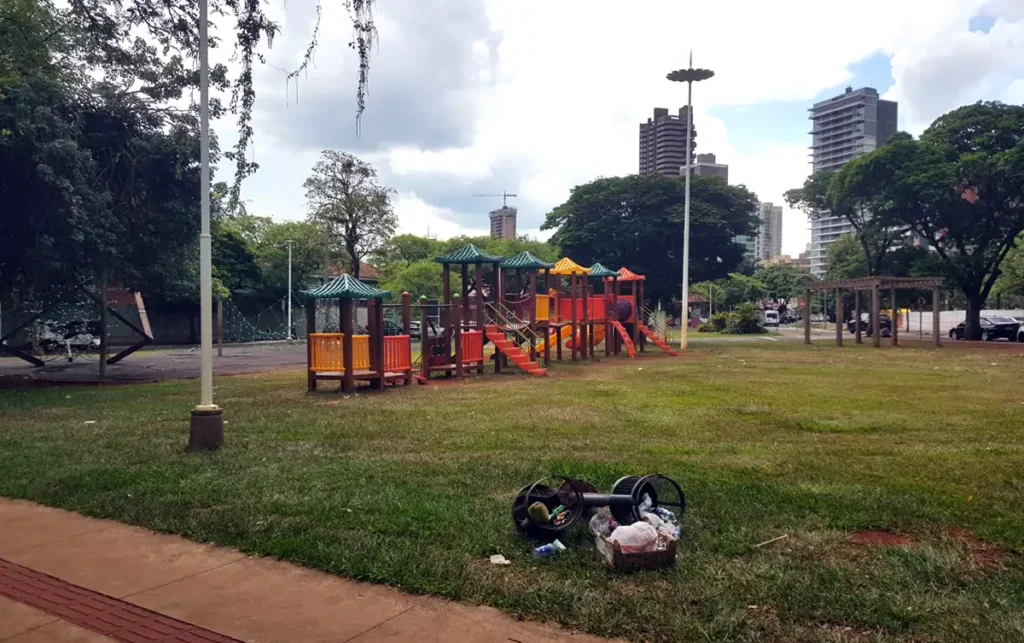 Cena maringaense Angelo Rigon 1 ano atrás Cesto de lixo caído há meses na praça Vereador Malaquias de Abreu, Zona 2, defronte a Câmara Municipal e a algumas quadras da prefeitura. “Retrato melancólico”, observou leitor.