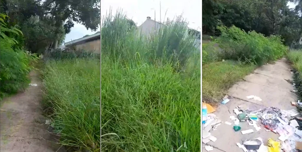 Moradores da redondeza deste terreno que pertence à Prefeitura de Maringá, na rua Rio Madeira, no Conjunto Branca Vieira, já fizeram pedido para uma roçada via 156, mas devem ser atendidos em 2025. O transeunte tem dificuldade de passar pela calçada.
