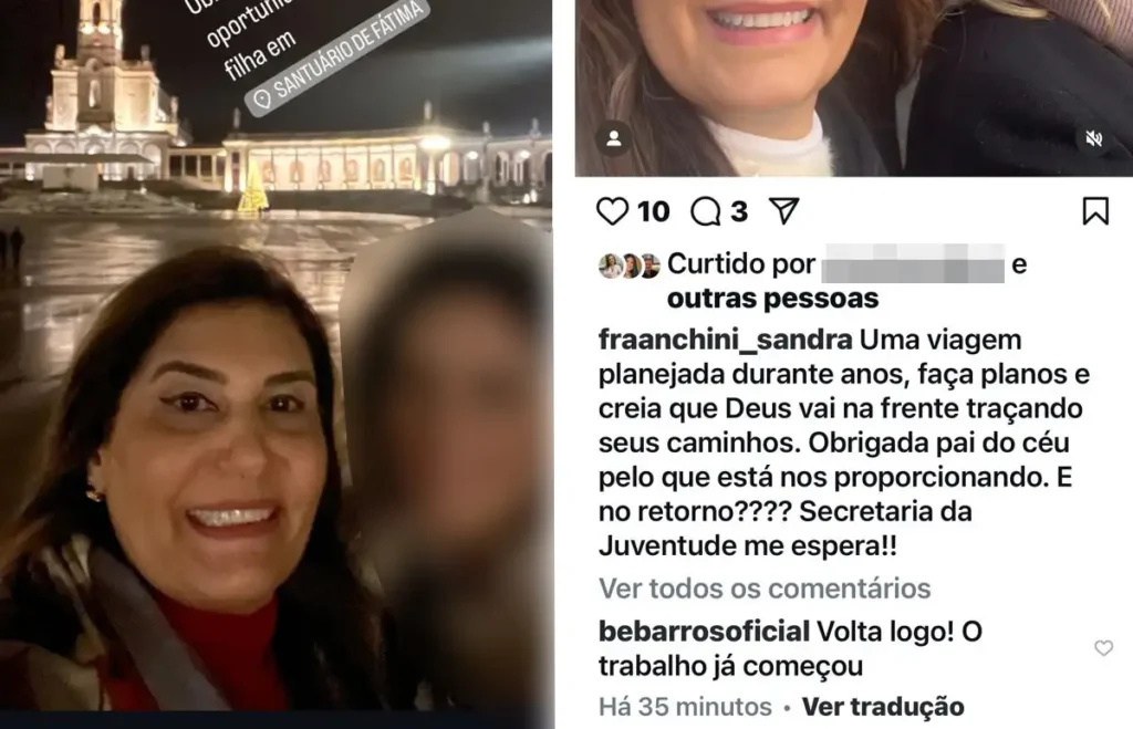 Sandra Franchini, nomeada secretária municipal de Juventude, Cidadania e Migrantes, está em Portugal e visitou o Santuário de Fátima. Ao postar que a viagem estava programada havia anos e que seu próximo desafio era a secretaria, recebeu um comentário da primeira-dama Bernadete Barros.