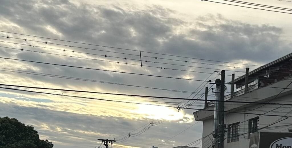 O dia em Maringá Angelo Rigon 1 ano atrás O Simepar prevê dia de tempo nublado, com pancadas de chuva (92% de probabilidade), com temperatura máxima de 27˚C, umidade relativa do ar entre 67% e 97 e pôr do sol às 19h14.