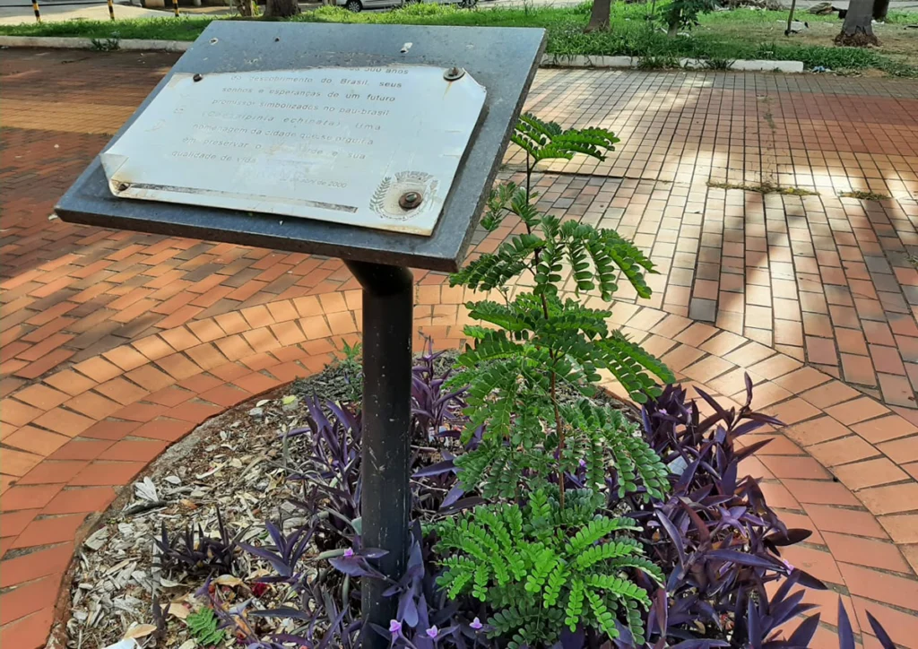 Em 2019 a árvore colocada pela prefeitura secou, mas com a informação veiculada aqui houve o replantio, com uma bonita muda. Em 2020 faltava apenas restaurar a placa, parcialmente danificada. Eis que agora, com as obras do eixo monumental em andamento, descobre-se que houve um crime ambiental, uma maldade, e que o pau-brasil não está mais lá.