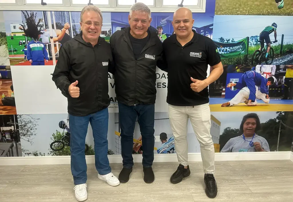 O secretário Hélio Renato Wirbiski (ao centro), que recebeu Agnaldo Baldo e Flavio Augusto Santos da Silva, o Flavinho, confirmou que haverá ainda este ano em Maringá capacitação para profissionais de educação física para atender crianças com espectro autista, e a realização do Paraná Combate, Jogos Aventura e Natureza e Paraná Master.
