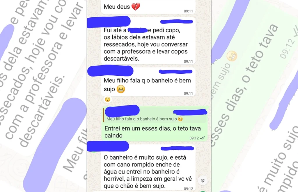 No grupo de WhatsApp que reúne pais de alunos do Centro Municipal de Educação Infantil Gerardo Braga (que fica na rua Santa Joaquina de Vendruna) há muita reclamação sobre falta de papel higiênico, de copo descartável para beber água e até alimentação e teto caindo.