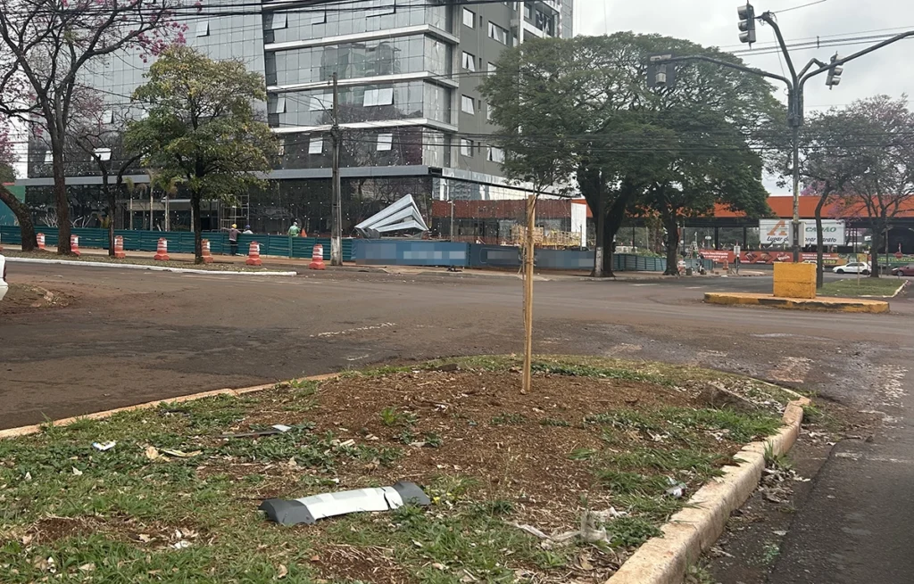 Cena do trânsito maringaense Angelo Rigon 2 meses atrás Na esquina das avenidas Carneiro Leão com Parigot de Souza, cones, semáforo e pedaços de um carro no canteiro central.