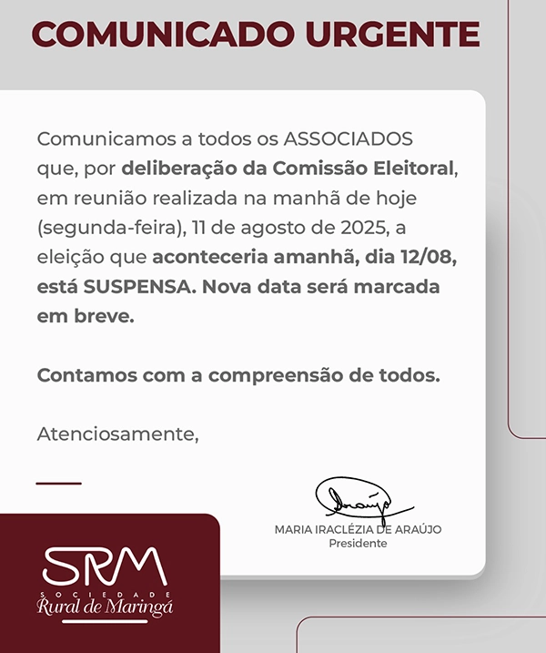 A eleição na Sociedade Rural de Maringá, marcada para amanhã, foi suspensa por decisão da comissão eleitoral, nesta manhã. Foram apontadas irregularidades no pleito, ainda não divulgadas, mas que contrariam o estatuto da entidade.