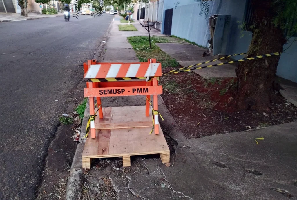 “Ainda bem que há madeira para sustentar o cavalete”, diz leitor. A situação havia sido registrada nesta manhã aqui. Foto de André Leandro Veneruci.