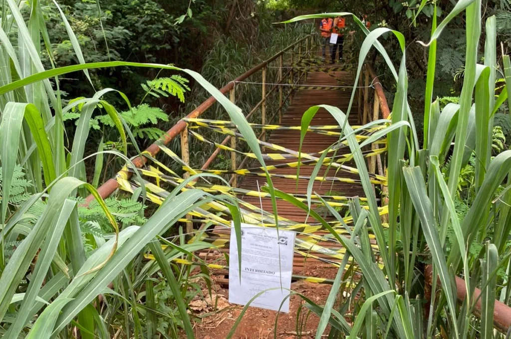 No ano passado a prefeitura foi acionada para analisar a localização, regularidade da construção, responsabilidade da obra e da sua manutenção e condições de segurança da pinguela, feita de madeira. A necessidade do laudo de vistoria é baseada na frágil estrutura, o que tudo indica que não há projeto, licença ambiental, alvará e identificação de responsabilidade, além de não constar do sistema viário do município, estando em área de preservação permanente do ribeirão Maringá.