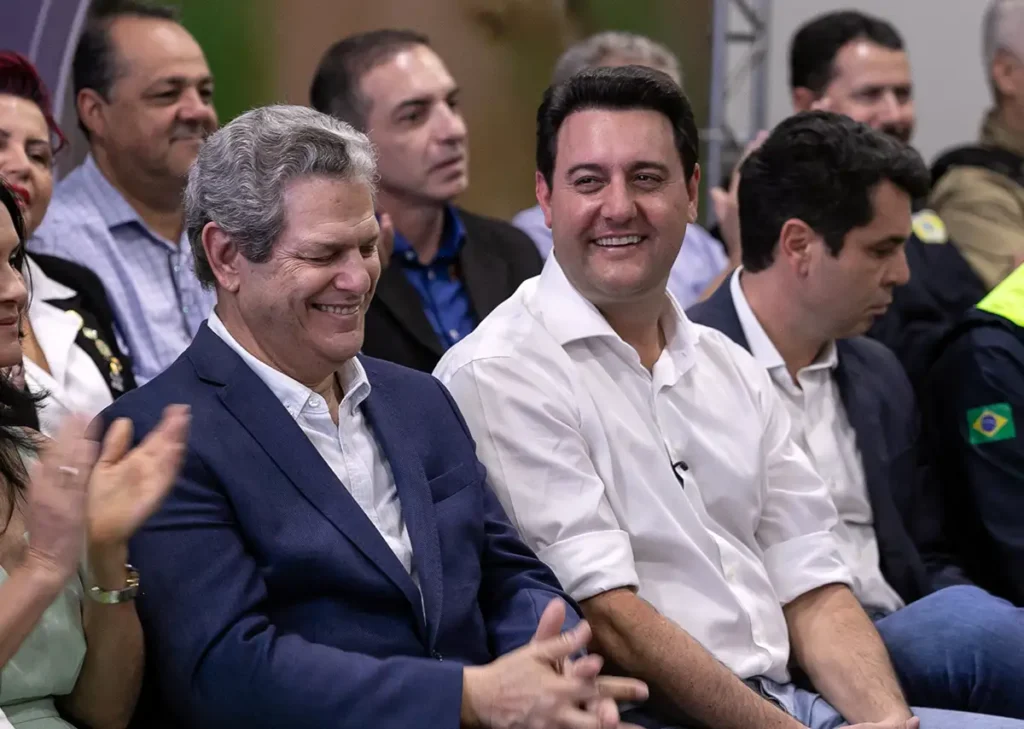 Na assinatura do convênio de R$ 450 milhões (valor revelado somente hoje), o governador Ratinho Junior (PSD) estava só sorrisos, ao lado do prefeito Silvio Barros II (PP). Atrás, o prefeito de São Jorge do Ivaí, Guina (PSD), e o secretário de Obras Artur Tunes.