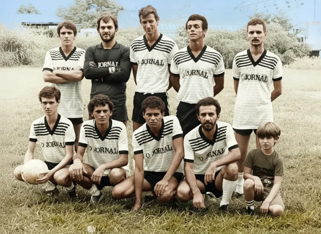 Formação do time de O Jornal, possivelmente em 1988, incluindo o goleiro Romário, o saudoso Claudio Struett, Sarandi (operador da impressora), Angelo Rigon e, sentados, Luciano Pozza, o fotógrafo Márcio Damásio, o corintiano Cassiano e Osvaldir e seu filho.