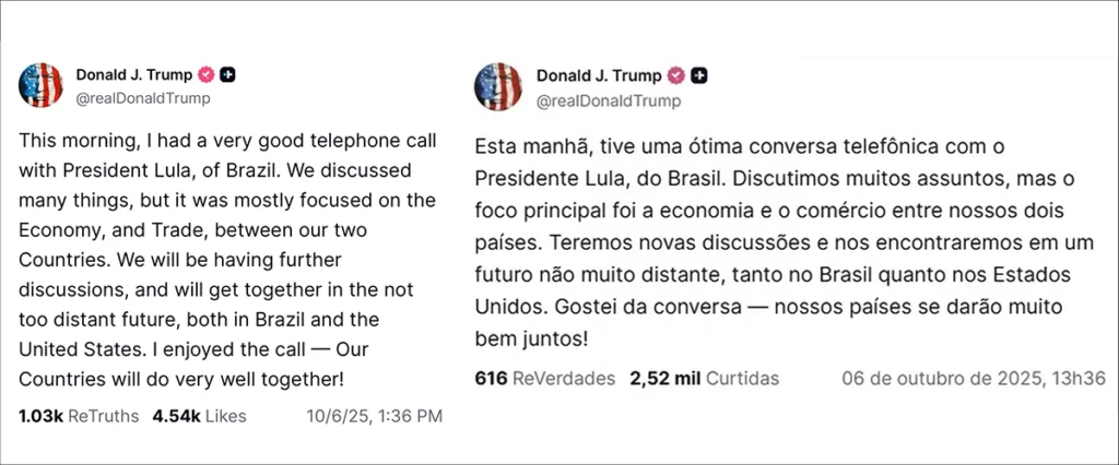 Os dois presidentes acordaram encontrar-se pessoalmente em breve. Lula sugeriu que o encontro seja durante a Cúpula da Asean, na Malásia. Ele reiterou convite a Trump para participar da COP30, em Belém; e se dispôs também a viajar aos Estados Unidos.