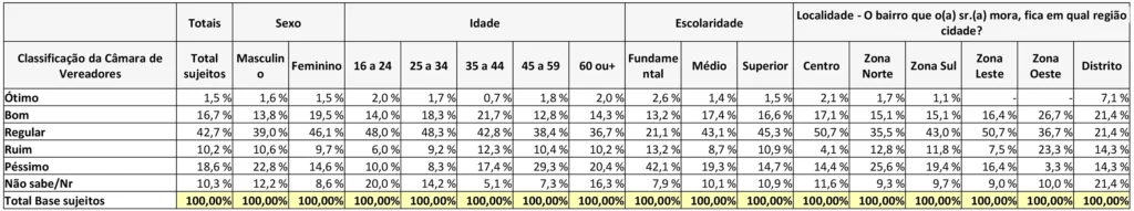 A crítica mais dura ao Legislativo está concentrada em dois grupos: a faixa entre 45 e 59 anos, em que o “péssimo” chega a 29,3%, quase o dobro da média geral, e entre o eleito com ensino fundamental, onde a nota atinge 42,1%. A classificação “regular” na Zona Sul, atinge 50,7% dos entrevistados, enquanto a avaliação “bom” tem seu maior índice na Zona Oeste (26,7%) e nos distritos (21,4%). Na Zona Oeste o percentual “ruim” (23,3%) é mais elevado.