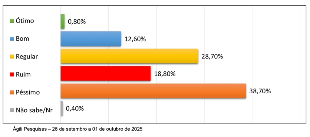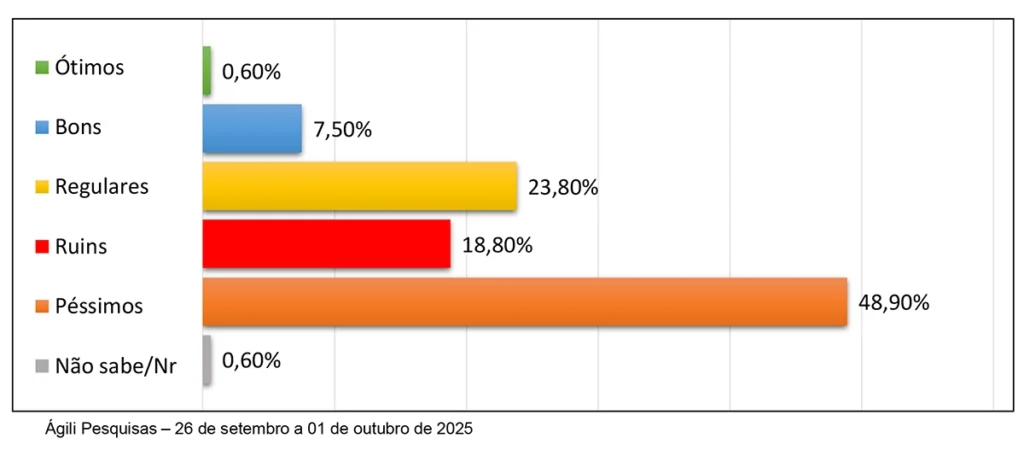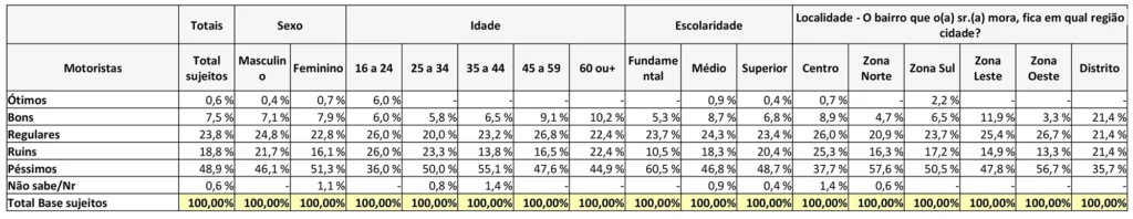 Apenas 8,1% classifica os motoristas como “bons” ou “ótimos”. A nota máxima não chega a 1%. Isso significa que, além dos problemas de infraestrutura, o comportamento imprudente e a falta de cortesia são vistos como a principal causa da percepção negativa no trânsito.