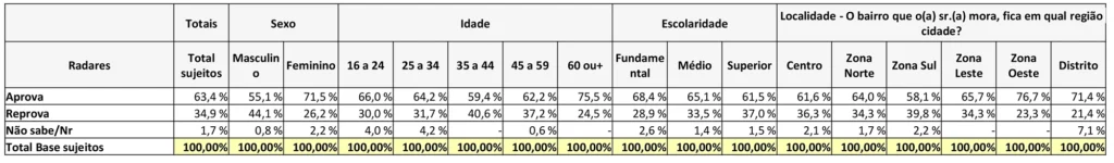 Radares aprovados – A pesquisa da Ágili mostrou ainda que a maioria dos maringaenses aprova os radares de controle de velocidade. Como se verifica no quadro acima, a maioria (63,40%) entende que a fiscalização eletrônica é uma forma eficaz de conter a imprudência, especialmente após a reprovação do comportamento dos motoristas.