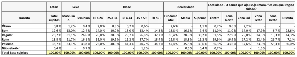 As mulheres são as mais críticas, com 43,8% apontando o trânsito como “péssimo”, contra 33,1% dos homens. Curiosamente, a avaliação negativa é menos intensa entre jovens de 16 a 24 anos, onde a nota “péssimo” fica em 26%, o menor índice da pesquisa, e a “ruim” atinge 32%. Confira o quadro com os dados acima.