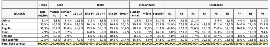 Educação – Já a classificação do quesito educação foi considerada boa pela maioria (35,50%), seguido de regular (31,30%). 7,90% responderam que é ruim e 7,20% que é péssima; 5,30% disseram que é ótima, sendo que 12,80% não souberam ou não quiseram responder.