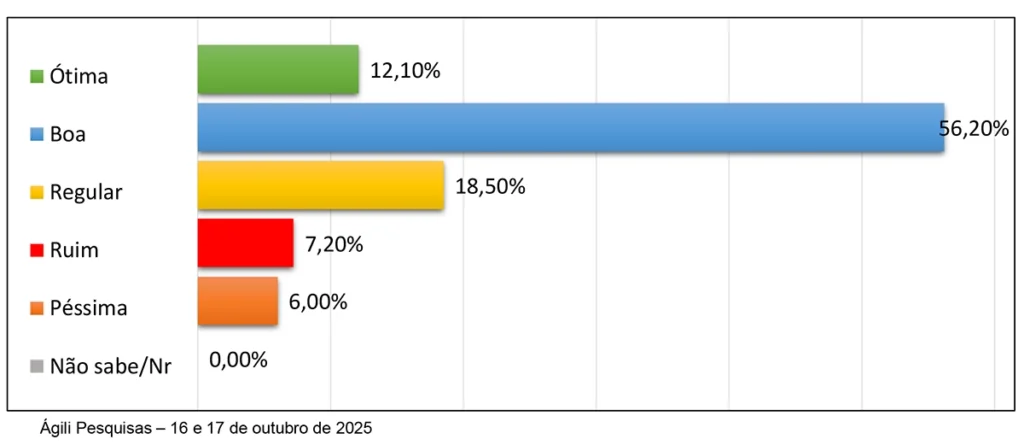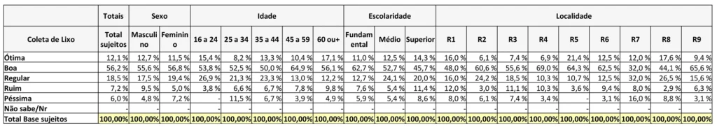A coleta foi apontada como ótima por 12,10%, sendo que 18,50% disseram ser regular, 7,20% ruim e 6% péssima.