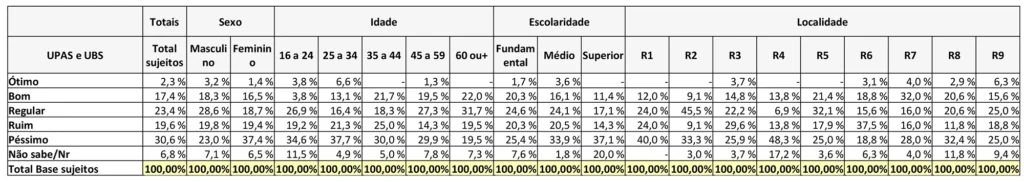 Saúde pública – Outro serviço questionado foi o oferecido pela Unidade de Pronto Atendimento (UPA) e unidades básicas de saúde. A maioria (30,60%) considerou o atendimento péssimo, seguido de 23,40% de regular, 19,60% como ruim e 17,40% de bom; apenas 2,30% consideraram ótimo o atendimento nesses locais.