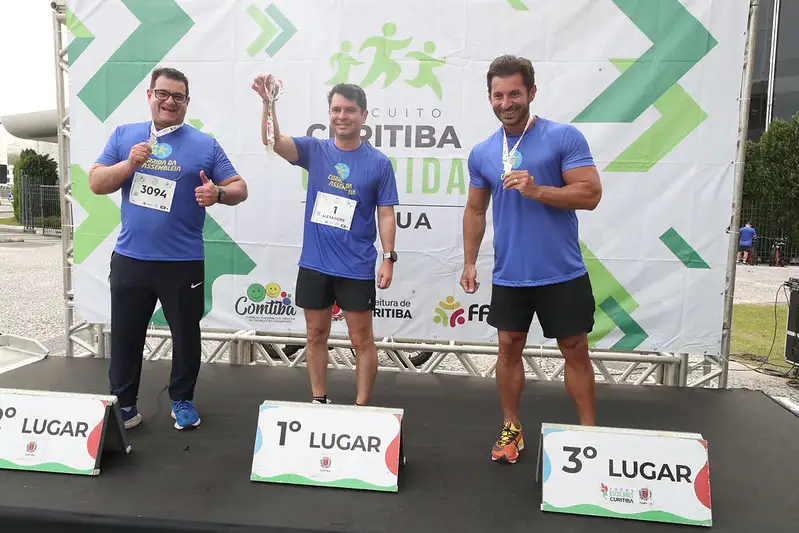 Os deputados Alexandre Amaro (Republicanos), esq., e Alexandre Curi (PSD), ao centro, participaram ontem da 1ª Corrida de Rua da Assembleia Legislativa do Paraná, que reuniu mais de 6 mil pessoas e arrecadou 6 toneladas de alimentos. Amaro completou os 5 km e Curi, que faz academia todos os dias, fez 10km em 52 minutos.