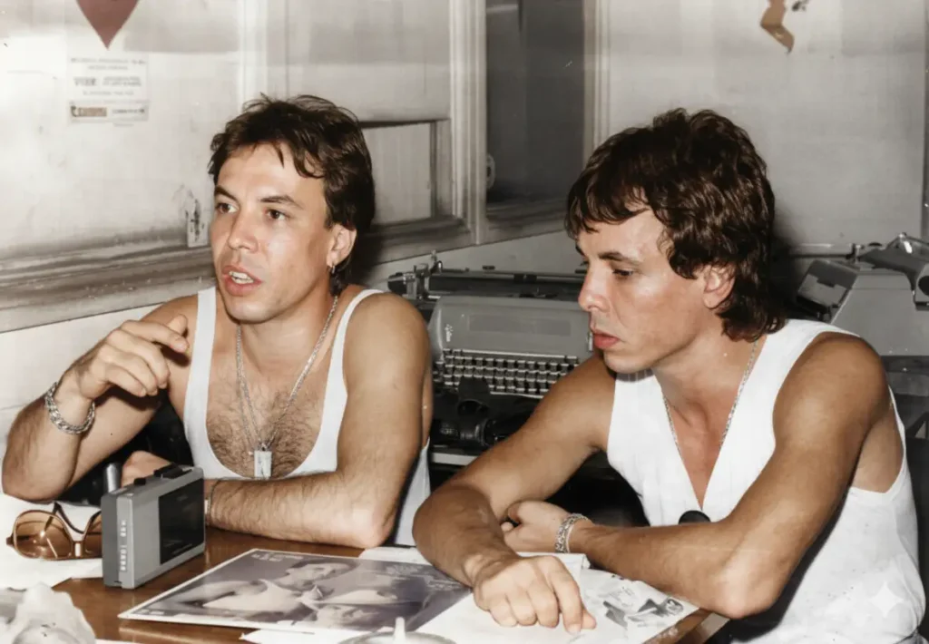 Chrystian e Ralf na redação do antigo O Diário do Norte do Paraná, na esquina das avenidas Tuiuti com Centenário (hoje, terminal rodoviário). Tinham acabado de vir de Londrina, divulgando um dos primeiros discos da dupla sertaneja, pela RGE.