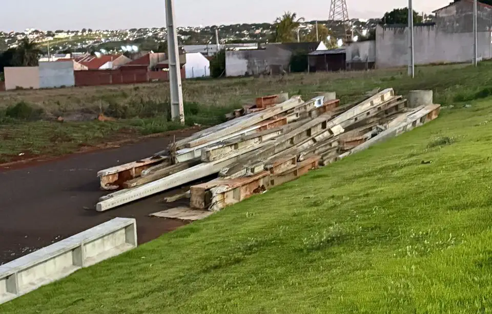 No final da avenida Kakogawa uma empresa está guardando postes na via, reclama leitor, reduzindo o espaço para recreação de moradores.