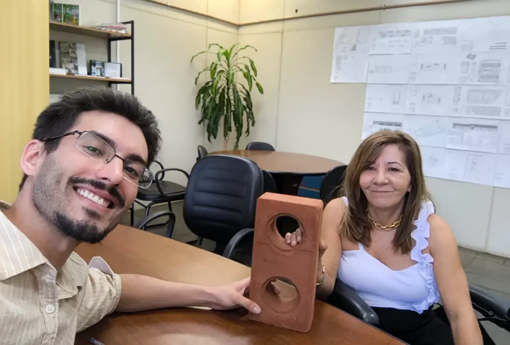 Maringá vai ter Condomínio da Pessoa com Deficiência; considerações finais sePessoa com deficiência aguarda realização do projeto do seu próprio condomíniorão tratadas hoje com o prefeito municipal; o secretário de Urbanismo e Habitação, Matheus Barros, ao lado da presidente da AMDF, mostra o material com o qual as residências serão construídas