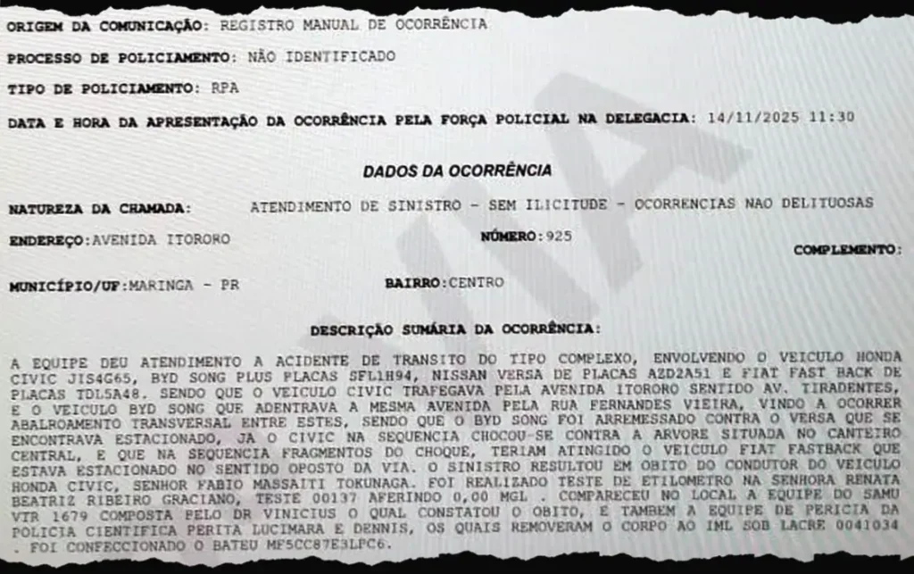 A ocorrência foi registrada como “ocorrência de sinistro, sem ilicitude, ocorrências não delituosas”. O boletim classifica o acidente de trânsito como sendo “do tipo complexo”, envolvendo o Honda Civic, que seguia pela avenida Itororó em direção à avenida Tiradentes, a uma quadra da avenida JK, onde existem semáforos e postos de combustíveis. Além do BYD que descia a rua, o acidente envolveu um Nissan Versa e um Fiat Fastback.