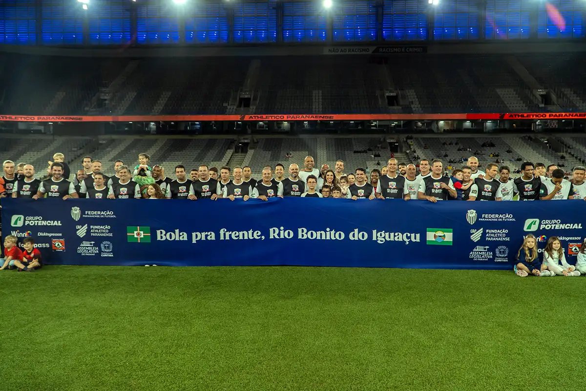 Esperança e Solidariedade. Os nomes dos dois times que entraram em campo nesta quarta-feira (19) na Arena da Baixada, em Curitiba, já demonstram o caráter do jogo solidário “Bola pra Frente”. A partida foi promovida pela Assembleia Legislativa do Paraná para arrecadar recursos para a cidade de Rio Bonito do Iguaçu, com a participação de jogadores que fizeram história com as camisas do Coritiba, Athletico e Paraná Clube. A partida terminou empatada em 8 a 8, mas o que mais importou foi a solidariedade da torcida e de todos os envolvidos.