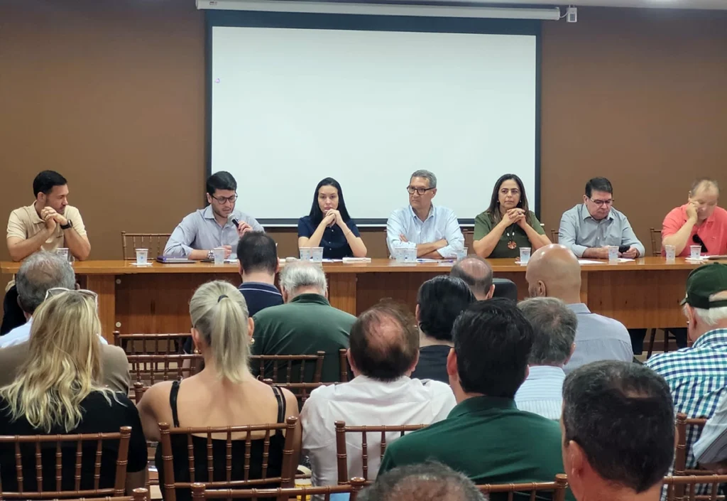 Acontece nesta manhã as assembleias ordinária e extraordinária da Sociedade Rural de Maringá, para apresentação da gestão fiscal 2024/25 e relatórios da diretoria 2023/2025. O presidente Carlos Henrique Pinto e a ex-presidente Maria Iraclézia de Araújo estão na mesa principal. Foto de Agnaldo Vieira