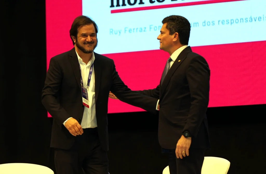 O senador Sergio Moro e Cristina Graeml promoveram ontem, em Curitiba, um evento com correligionários para debater segurança pública com a presença de um investigado pela Polícia Federal: Antonio Rueda, presidente do União Brasil.