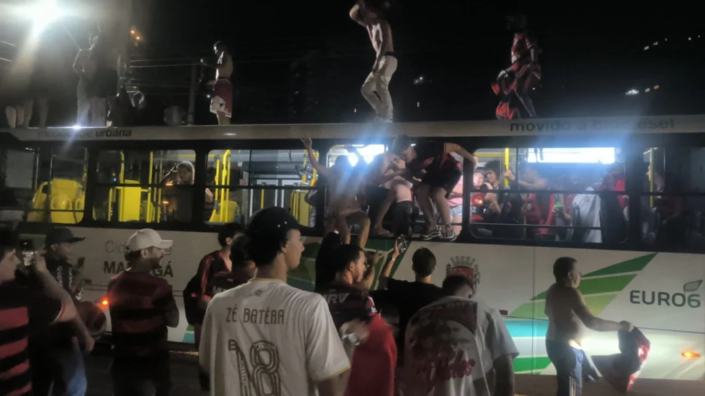 A comemoração do título do Flamengo, na noite do sábado, em Maringá teve vandalismo. Não é coisa de torcedor de verdade. O ônibus é usado por trabalhadores, é bem público. Dentro do veículo também houve vandalismo, resultando em prejuízo para usuários, já que houve ataque a equipamentos de mobilidade e janelas. Até onde se levantou, esta foi a primeira vez que um ônibus do transporte coletivo foi tomado por torcedores-vândalos.