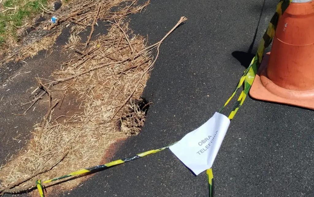 Há poucos dias, na avenida Kakogawa, taparam esse buraco, como registrado em setembro, mas, já se abriu novamente, aponta leitor. Um papel informa que é obra de telefonia.
