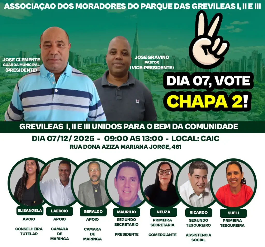 Domingo tem eleição para a nova diretoria da Associação de Moradores do Parque das Grevíleas I, II e III, das 9h às 13h, no Caic. José Clemente, da GCM, é candidato a presidente pela chapa 2, que tem apoio, entre outros, de Laércio Rodrigues e Geraldo Martins e da conselheira tutelar Elisangela Nunes.