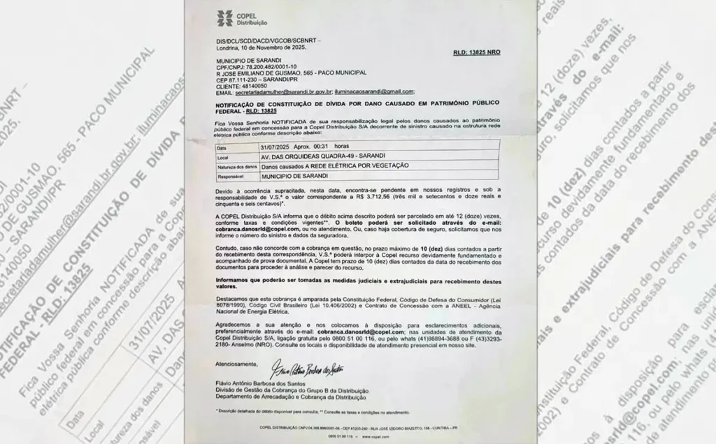 A Copel notificou a Prefeitura de Sarandi em 10 de novembro alegando que encontra-se pendente em seus registros o valor correspondente a R$ 3.712,56. “A Copel Distribuição S/A informa que o débito acima descrito poderá ser parcelado em até 12 (doze) vezes, conforme taxas e condições vigentes”, diz a mensagem, indicando o e-mail para solicitação de boleto, que informe se há cobertura de seguro para a cobrança do sinistro à seguradora e que, não concordando, pode interpor recurso em até 10 dias do recebimento. “Informamos que poderão ser tomadas as medidas judiciais e extrajudiciais para recebimento destes valores”, diz a notificação de cobrança, que estaria amparada pela Constituição, Código de Defesa do Consumidor, Código Civil Brasileiro e pelo contrato de concessão com a Agência Nacional de Energia Elétrica (Aneel). Assina o documento Flávio Antônio Barboza dos Santos, da Divisão de Gestão da Cobrança do Grupo B da Distribuição