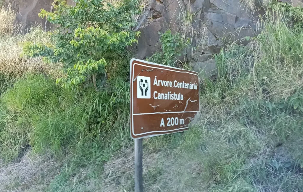 A placa, na PR-182, em Salgado Filho, faz lembrar que a subida na canafístula centenária de Maringá completou 18 anos no mês passado.