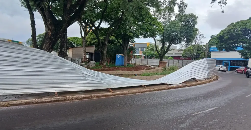 Caiu parte do tapume metálico na praça Souza Naves, na avenida Brasil com Tuiuti, onde as obras da ciclovia chegam a 64,92%, segundo o site da Prefeitura de Maringá. Em 28 de novembro do ano passado foi assinado termo aditivo prorrogando os prazos de execução e vigência do contrato para 26 de março de 2026.