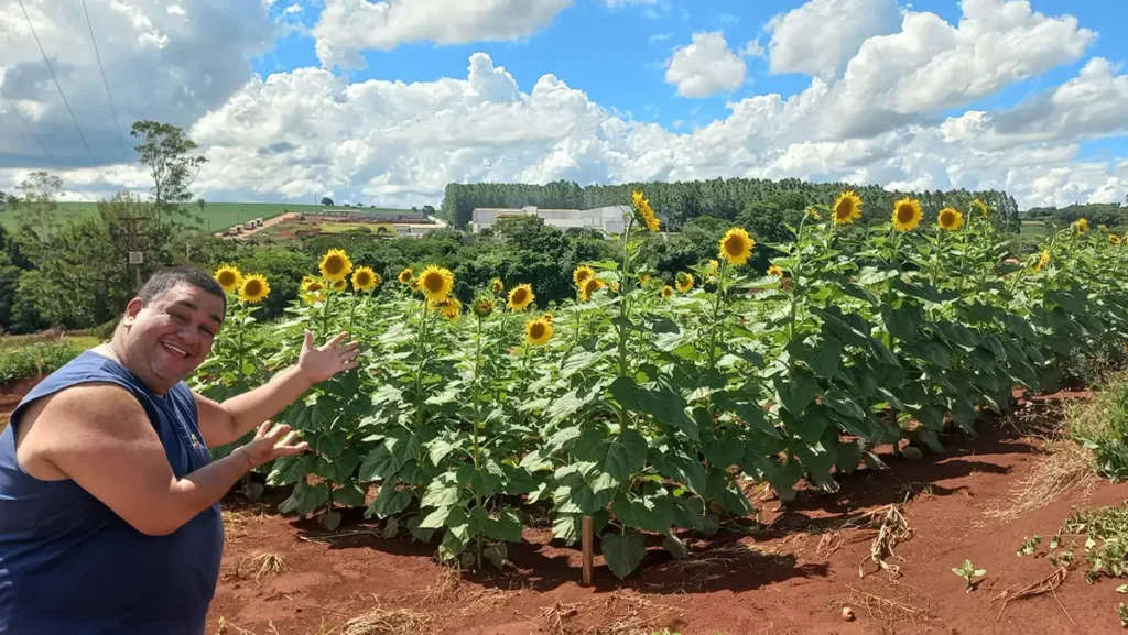 O professor de Agronomia Julio Colella mostra que já é época de girassóis em Maringá, cenário para fotos e vídeos. A área, no Ouro-Cola, fica localizada aqui.