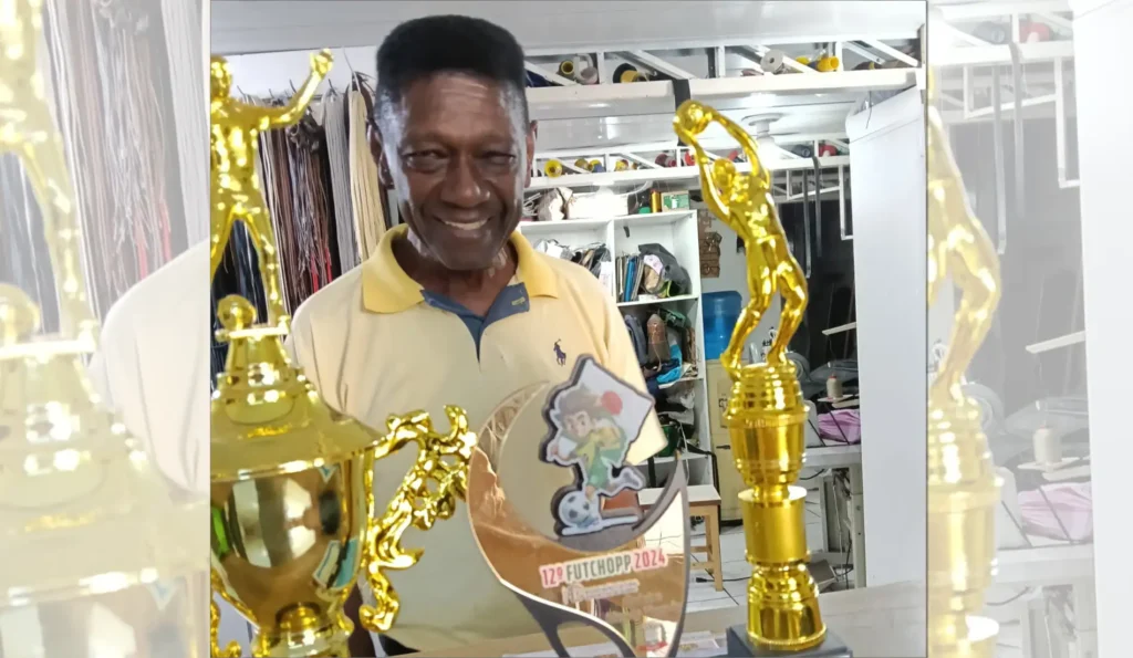 Sapateiro há 55 anos, Wanderley Guilherme da Silva, o cantor Rebite, é patrimônio de Maringá e tem seu lado esportivo premiado. Foi o goleiro menos vazado em competições de futebol suíço em 224 e 2025 e recentemente vice-campeão na categoria Diamante na Acema. Foto de Jorge Villalobos.