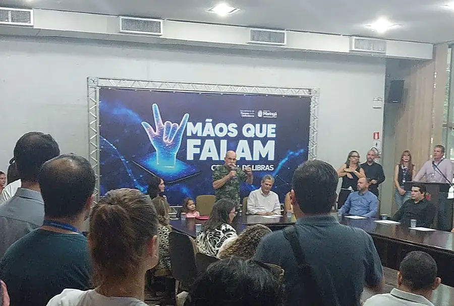 O deputado federal Sargento Fahur (PSD), conhecido por defender armas e disparar palavrões, fala ao lado do prefeito, que já ´foi contra Guarda Municipal armada, ontem à noite, durante lançamento e plataforma de interpretação de Livras intitulada “Mãos que falam”.