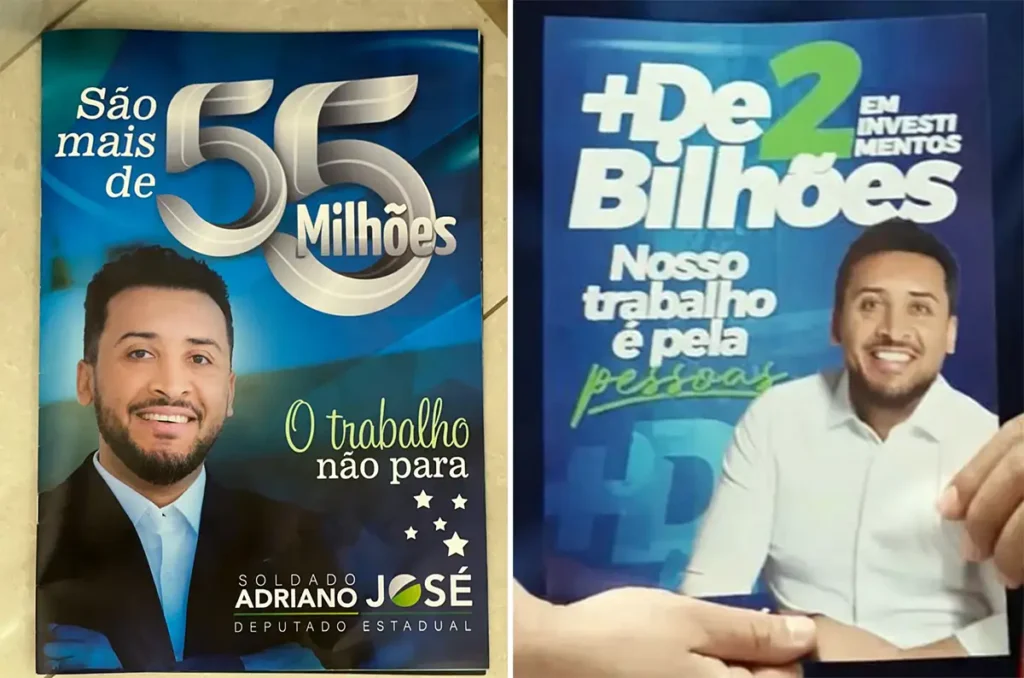 Outros deputados contestam, mas deputado alega ter viabilizado R$ 250 milhões por ano em investimentos para o estado; acima, propaganda de 2022 e 2026