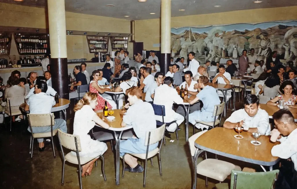 O interior do famoso Bar Colúmbia, de Américo Dias Ferraz – segundo prefeito da cidade e o único a não ter nome em próprio público desde que derrubaram a rodoviária municipal -, na avenida Getúlio Vargas, em foto colorizada, do acervo de JC Cecílio.
