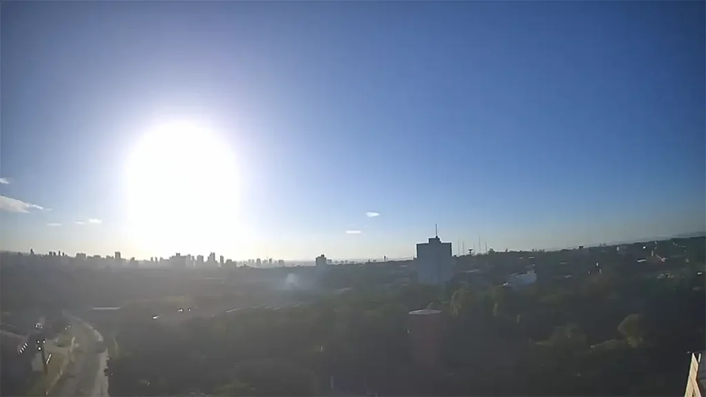 Segunda-feira de céu claro, sem chuva, com temperatura máxima de 35˚C, umidade relativa entre 39% e 81% e por do sol às 19h09. Para amanhã a previsão é de tempo parcialmente nublado, com pancadas de chuva.