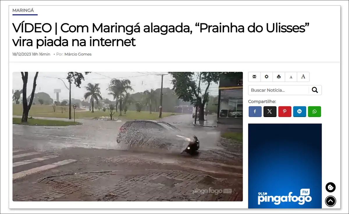 Alagamentos em pontos específicos de Maringá sempre foram alvo de cobrança da população – e de risos. É o caso do ocorrido na avenida Guaiapó, na administração passada: a inundação da via ocorreu na mesma época da prometida e nunca realizada prainha. O site Pinga Fogo fez o registro acima.