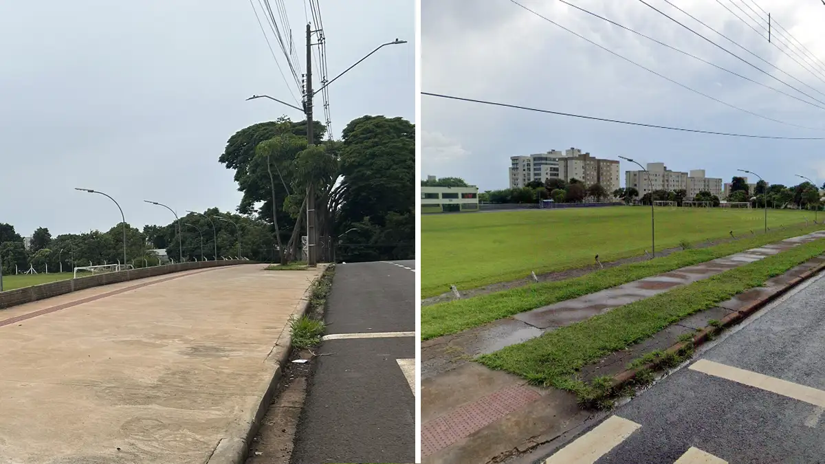 Na avenida Franklin Roosevelt, onde fica o Estádio Roberto Duque da Rocha, fotos (da esq. p/ a dir.) de 2026 e 2024, dentro do estilo impermeabilização das calçadas.